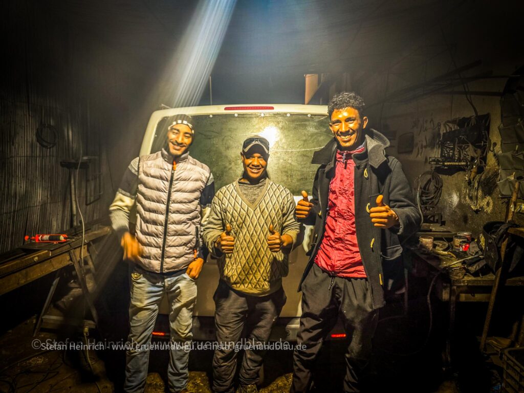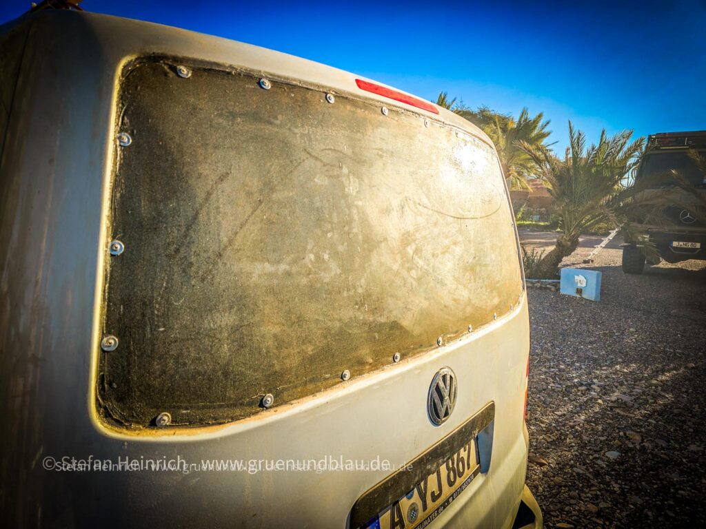 In Marokko explodiert mir die Heckscheibe zweimal innerhalb von 3 Wochen. Da muss der marokkanische Metallkünstler ran. Um 15.00 Uhr fahre ich bei ihm auf den Hof, um 22.00 Uhr machen wir, vor dem Kunstwerk ein Gruppenfoto. Er frägt noch: „Soll ich es dir noch lackieren?“